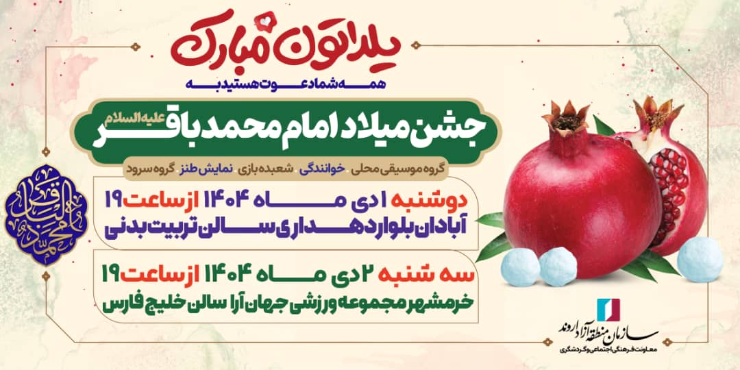 جشن بزرگ میلاد پنجمین پیشوای شیعیان، حضرت امام محمدباقر(ع)، همزمان با آیین کهن شب یلدا، در منطقه آزاد اروند برگزار میشود.